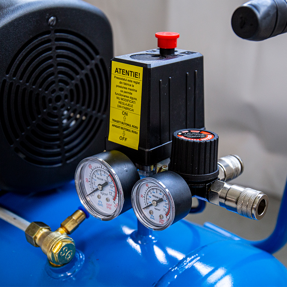 AIR2SHU850 are un randament imbunatatit, o constructie robusta si este echipat cu presostat, regulator de presiune, manometru, supapa de siguranta, robinet de purjare a condensului, roti si maner pentru transport.