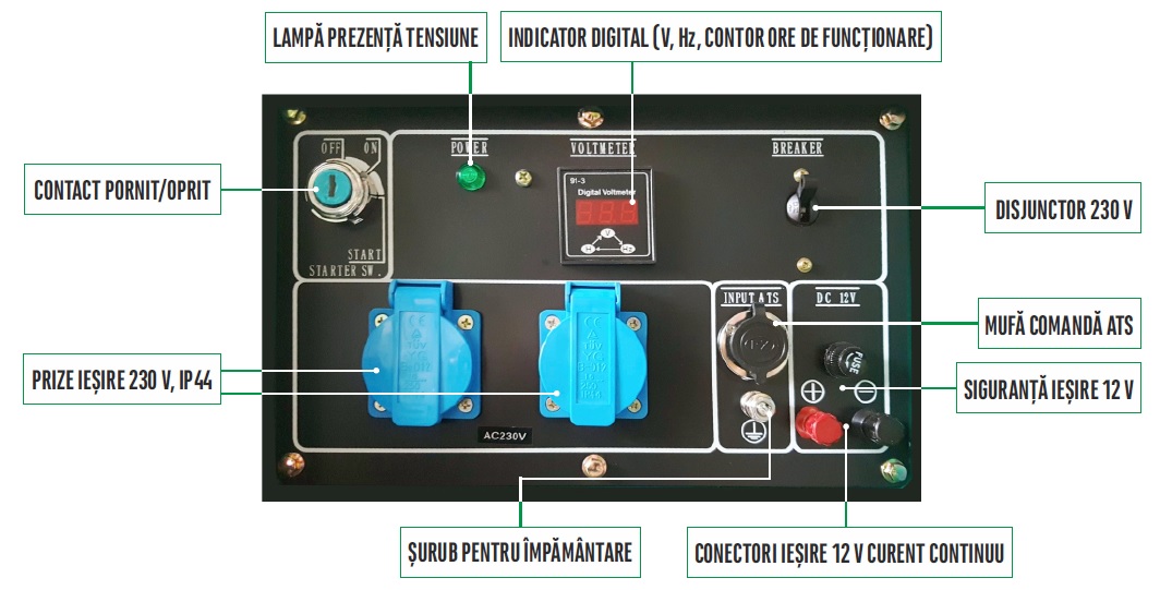 ② GENERATOR - bec de culoare verde - este aprins cand sarcina este cuplata pe generator