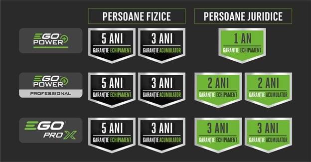 Persoane juridice: garantie 1 an pentru modelele EGO Power+, 2 ani pentru masinile si acumulatorii din gama EGO Power Professional si 3 ani pentru masinile si acumulatorii din gama EGO PRO X.